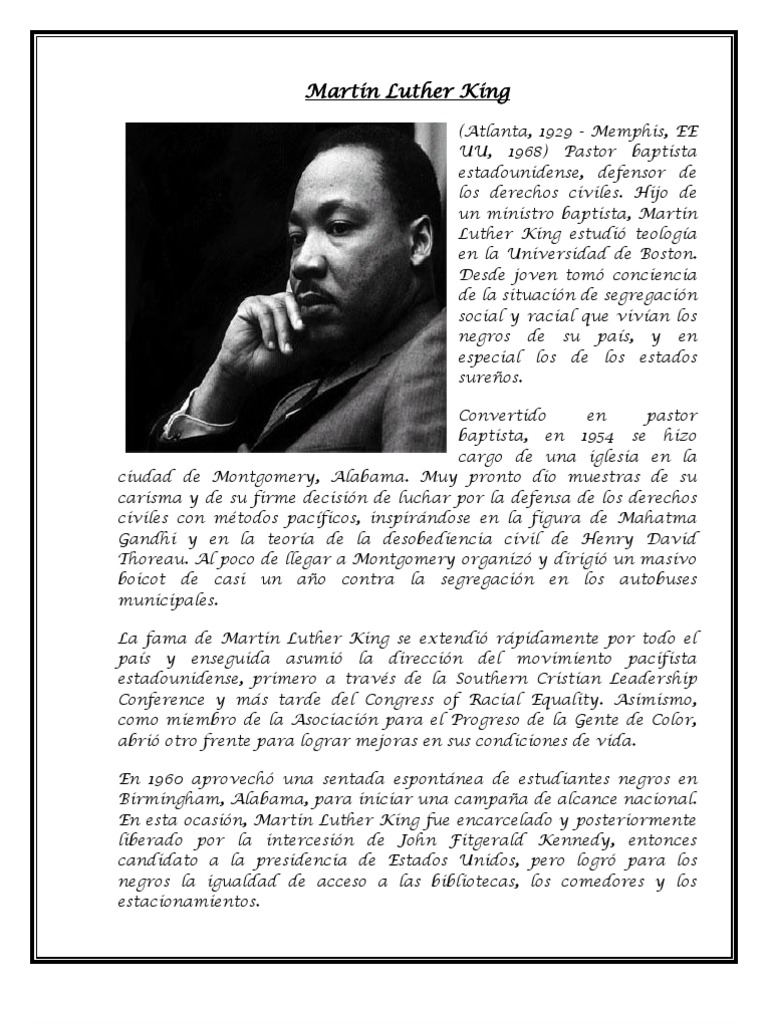 Biografia de Martin Luther King. Em 1948 terminou a faculdade de sociologia pela Morehouse College. Biografa de Martin Luther King un resumen plis 1 Ver respuesta wongsophia202 est esperando tu ayuda.